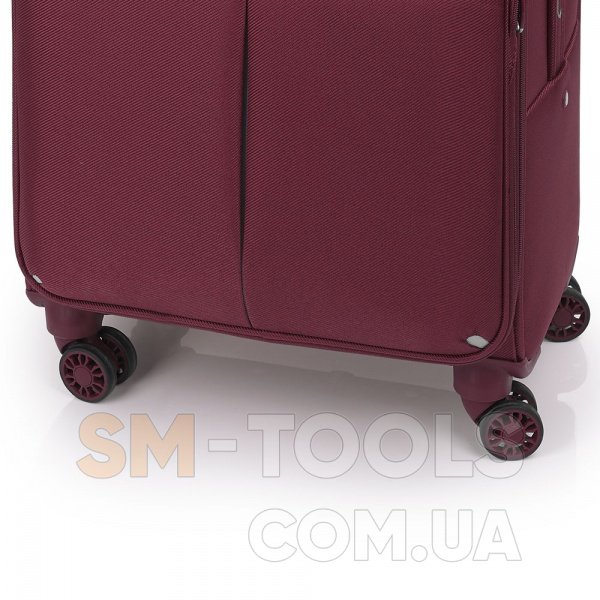 Чемодан оснащен четырьмя спаренными роликовыми колесами из высокотемпературного термопластичного полиуретана (TPU). Материал обладает прочностью сравнимой с пластиком, гибкостью силикона, а так же имеет повышенную устойчивость к перепадам температур. Отличительной особенностью колес из TPU материала является снижение шума до минимума при качении чемодана по неровной поверхности. Благодаря устойчивости к истиранию материал колес отличается длительным сроком эксплуатации.