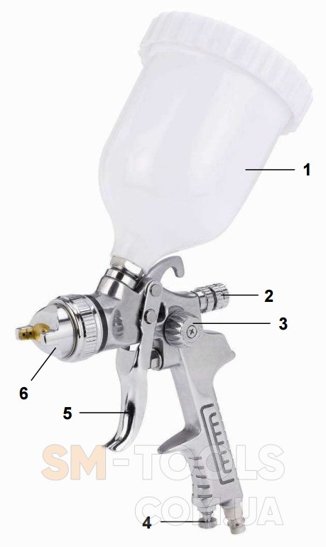 Краскопульт лакокрасочный Einhell Profi предназначен для нанесения методом напыления краски и лаков. Краскопульт является надежным и точным устройством с рабочим давлением от 3 до 3,5 бар. Краскопульт позволяет установить поворотное сопло (6) в нужное положение в зависимости от направления движения при нанесении краски. При помощи регулятора точечная струя - широкая струя (3) и регулятора количества подоваемой краски (2) можно предварительно установить желаемое распыление и количество наносимого вещества. Бесступенчато работающий спусковой рычаг (5) позволяет осуществлять точную дозировку разбрызгиваемого вещества. Чем сильнее будет нажат спусковой рычаг (5), тем больше краски будет примешиваться к сжатому воздуху. Максимальное количество подоваемой краски может быть ограничено при помощи регулятора количества (2). Количество подоваемого воздуха можно установить регулятором количества воздуха (4).