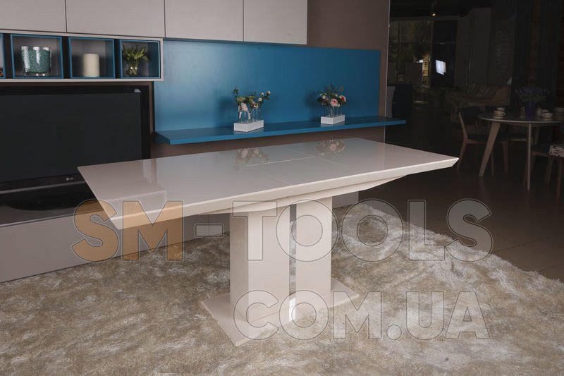 Столешница и дополнительные панели сделаны из МДФ глянцевого цвета мокко. Столешница имеет косые торцы. Для сохранности превосходного внешнего вида рекомендуется использовать подставки или салфетки под тарелки и столовые приборы. Дополнительная панель располагается посередине. Чтобы разложить стол, нужно просто раздвинуть стеклянную столешницу и достать вставку. Детали раздвижного механизма сделаны из металла и рассчитаны на длительный срок эксплуатации.