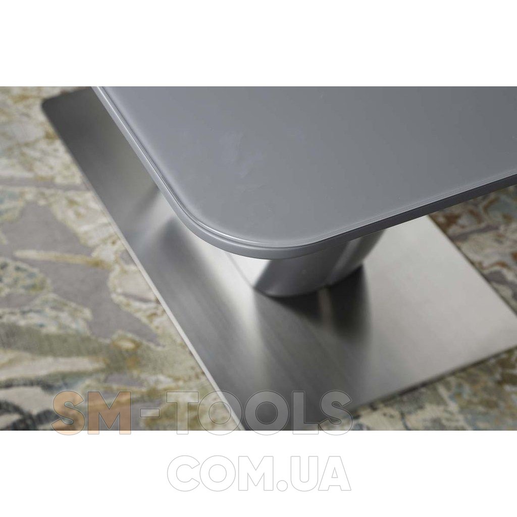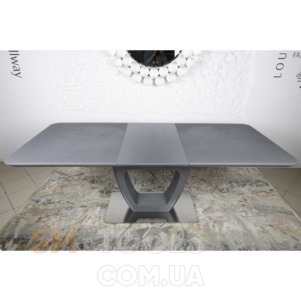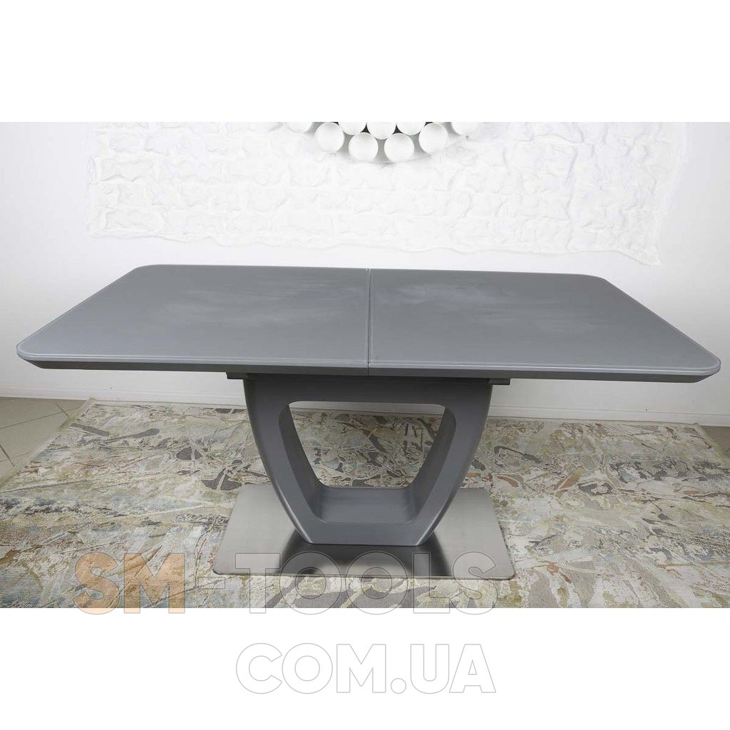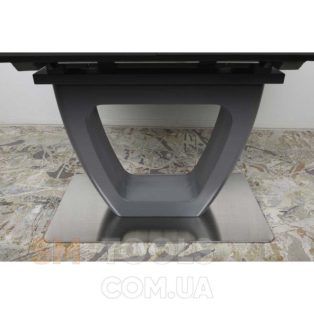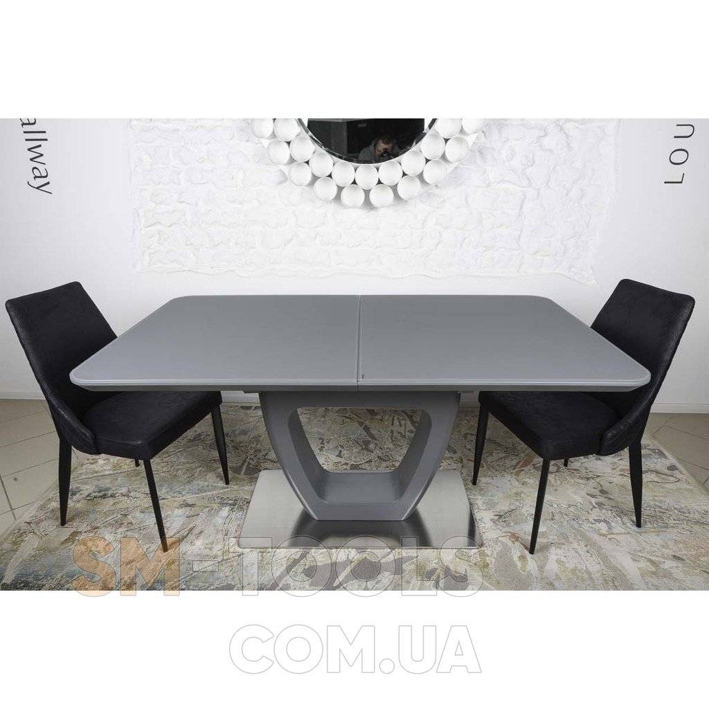 Столешница сделана из матового закалённого стекла тёмно-серого цвета на базе из МДФ. На такой столешнице практически не заметны отпечатки пальцев и следы от посуды, но мы рекомендуем использовать подставки или салфетки под тарелки и столовые приборы. Дополнительные панели располагается посередине, сделаны из МДФ, окрашенного в тон столешницы. Чтобы разложить стол, нужно просто раздвинуть стеклянную столешницу и достать вставки. Детали раздвижного механизма сделаны из металла и рассчитаны на длительный срок эксплуатации.