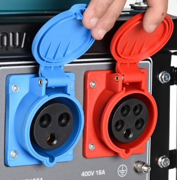 Панель керування генератора оснащена ергономічними роз’ємами для підключення однофазних і трифазних споживачів. Потужні розетки виготовлені з високоякісного термостійкого пластику.