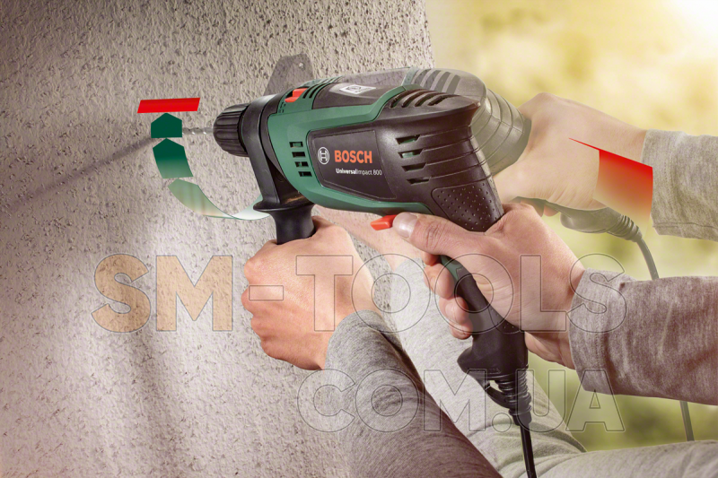 Ударная дрель BOSCH UniversalImpact 800 БЗП - новинка, мощный 3-режимный электроинструмент из серии "Домашний мастер" в компактном исполнении корпуса с минимальным весом (всего 1,7 кг), работает в режиме "Завинчивание/Сверление/Сверление с ударом", с инновационной системой Bosch Kickback Control. Модель ударной электродрели BOSCH UniversalImpact 800 БЗП предназначена для работы с бетоном (сверление, завинчивание шурупов), древесиной (сверление, завинчивание шурупов, полирование), черными металлами (сверление, завинчивание шурупов), пластиком (сверление, завинчивание шурупов, полирование), камнем (сверление, завинчивание шурупов), натуральными материалами (сверление), минеральными материалами (полирование). Мощный двигатель 800 Вт, установленный в электродрель ударную BOSCH UniversalImpact 800 БЗП, позволяет выполнять сверление бетона. Дрель BOSCH UniversalImpact 800 БЗП оснащена БЗП Bosch-Auto-Lock для быстрой смены оснастки. Наличие реверса позволяет выполнять выкручивание шурупов и устранять ситуации при заклинивании оснастки в заготовке. Частота вращения оснастки регулируется электроникой посредством кнопочного выключателя - благодаря точной регулировке, возможно сделать засверливание гладких поверхностей и закручивание шурупов. В этой модели реализована инновационная дополнительная рукоятка с максимально надежной фиксацией и удобным хватом без скольжения.