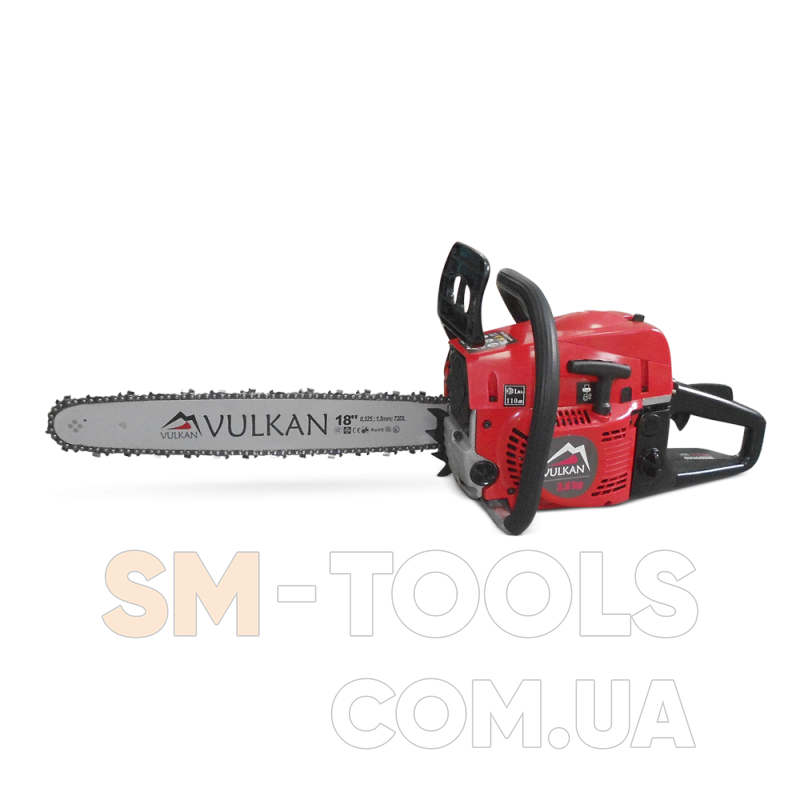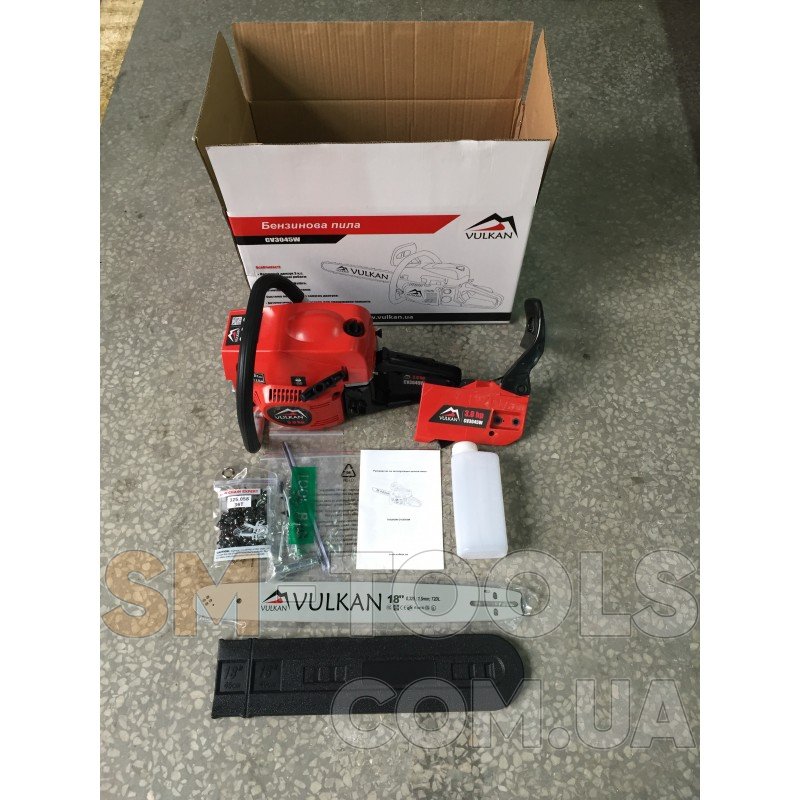 Бензопила Vulkan CV3045W – является оптимальным соотношением доступной цены и хорошего качества. Пила действительно качественная и имеет следующие характеристики: шина длиной 45 см справляется с бревнами до 40 см, 2-х тактный бензиновый двигатель мощностью 3 л.с. и объемом цилиндра 52 куб. см. в паре с цепью «супер зуб» может резать дерево любой породы и твердости. Система аварийного торможения защитит вас от соскакивания пилы с режущей поверхности, а амортизационная антивибрационная система создаст комфорт во время работы, что позволит пилить еще дольше. Так же имеет защиту от случайного включения. Относительно тихая, как для пилы своего класса, всего 110 дБ. Тип запуска – ручной. Инструмент является бытовым, потому производитель советует работать им по системе 15мин. работы 2-5 минут пауза, для полного охлаждения двигателя. С помощью напильников входящих в комплект можно без проблем заточить цепь в домашних условиях, для этого желательно иметь только тиски для фиксации шины с цепью.