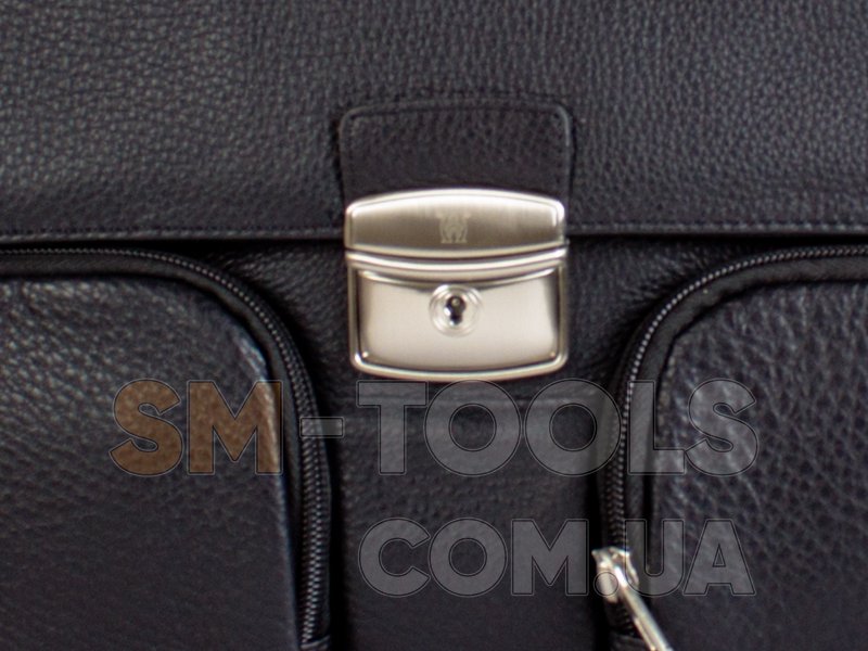 Солидный кожаный мужской портфель для делового мужчины. С этим портфелем вы сможете переносить все свои вещи. Большое преимущество его в том, что он очень вместительный. На лицевой стороне портфеля присутствует два накладных кармана на молниии, в одном из которых есть брелок-держатель для ключей. По бокам портфеля есть накладные кармашки, в одном из них присутствует ключик от замочка на клапане. На задней стороне портфеля есть карман на молнии. Внутри портфеля есть два отделения, три кармана на молнии, три накладных кармана, семь отделений для пластиковых карточек и три держателя для ручек. Длина ручки не регулируется и составляет 23 см. Высота от края сумки до крайней точки ручки составляет 5 см. Подклада выполнена из плотной ткани черного цвета.