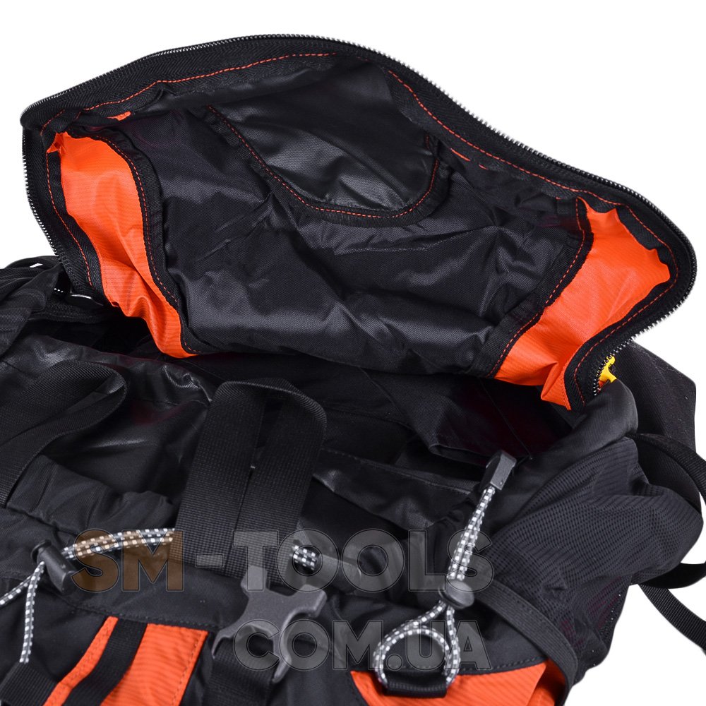 возможность крепления на рюкзак дополнительного оборудования (карабины, снегоступы, кошки, каски, палатки, спальники, лопаты, ледорубы, ледовые инструменты и т.д.), липучка для фиксации ледоруба и треккинговых палок;