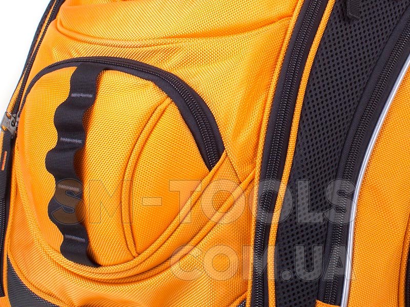- 3 вертикальных кармана разной величины на молниях по бокам рюкзака: 2 - с одной стороны и 1 – с другой; в одном из карманов находятся пластиковая петля для крепления ключей или других мелких вещей и маленький карман-сеточка на резинке;