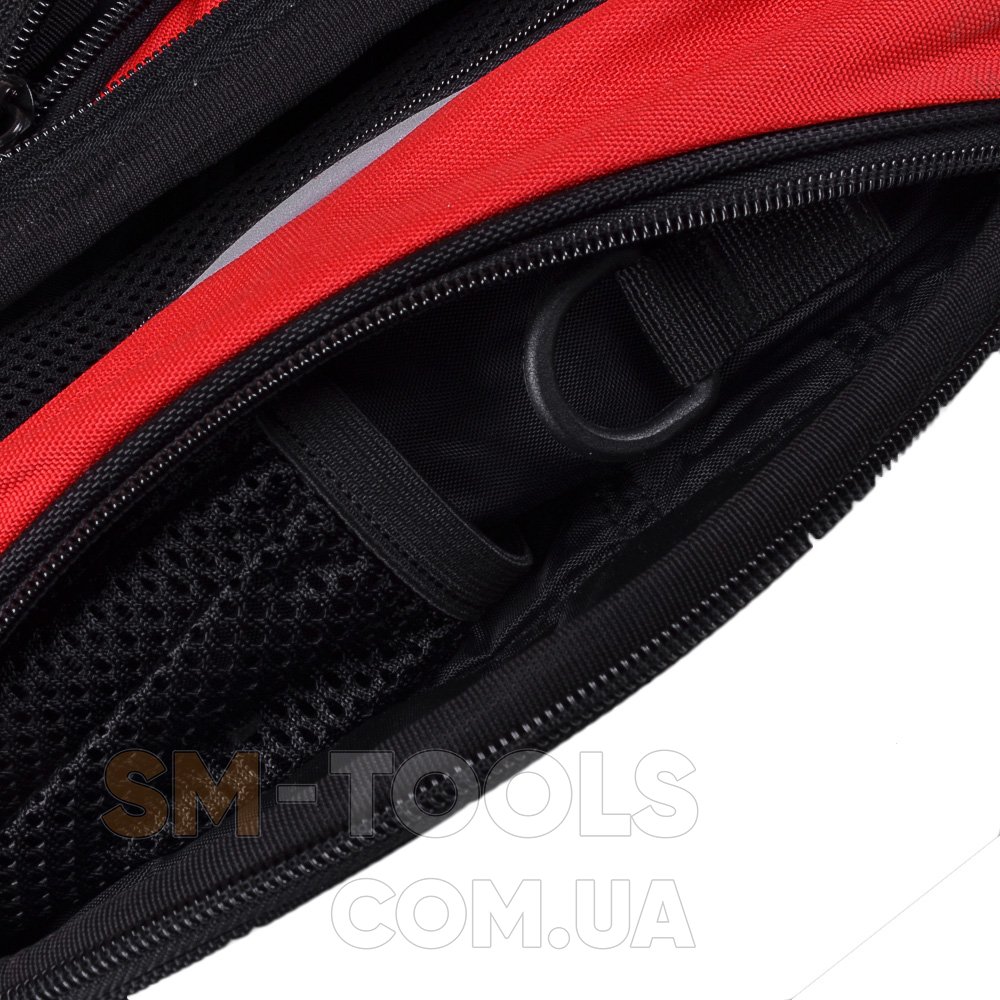 3 вертикальных кармана разной величины на молниях по бокам рюкзака: 2 - с одной стороны и 1 – с другой; в одном из карманов находятся пластиковая петля для крепления ключей или других мелких вещей и маленький карман-сеточка на резинке;