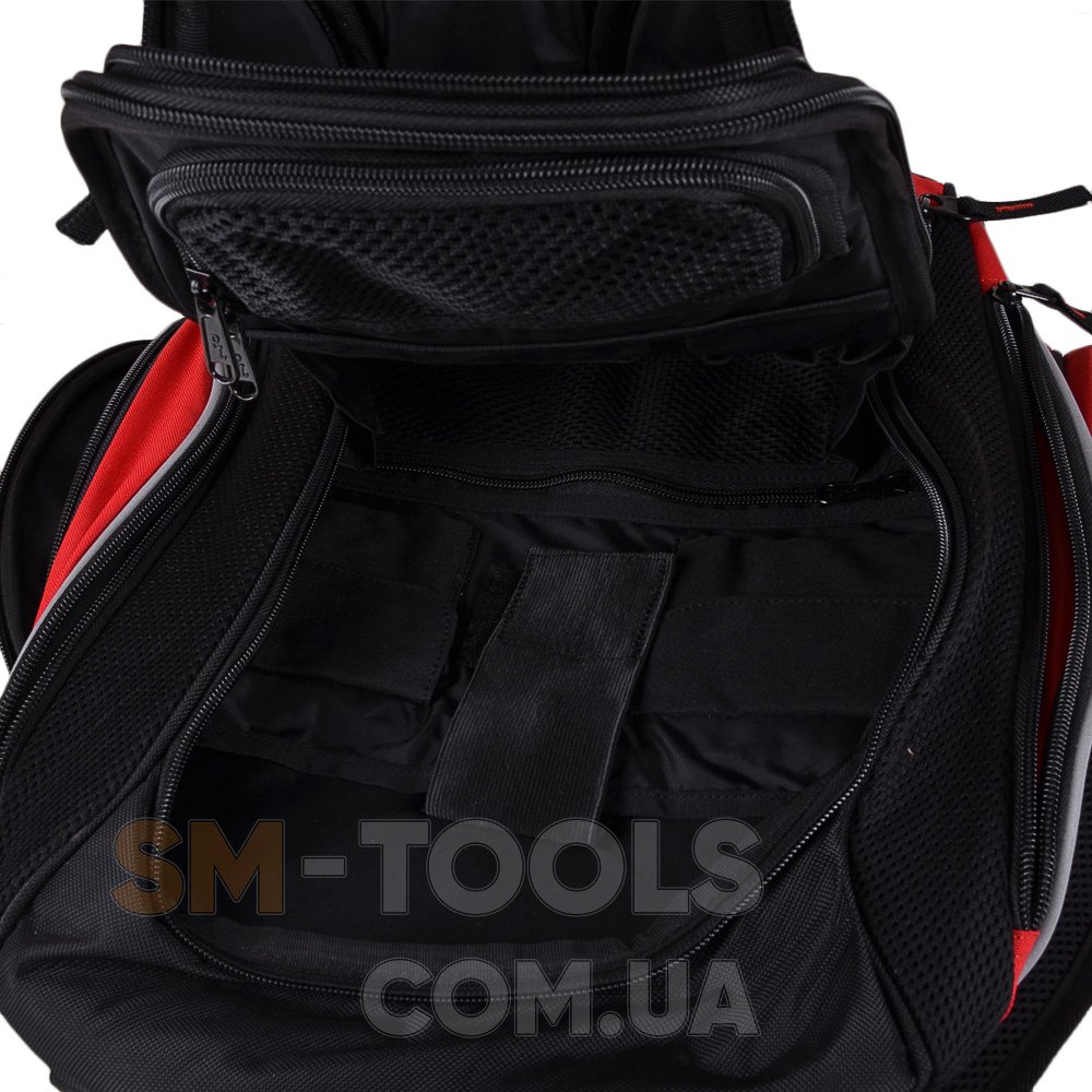 одно большое отделение на двусторонней молнии, в котором присутствует мягкий и уплотненный карман на липучке для ноутбука и бесчисленное множество карманов разнообразных форм и размеров как с различными застежками, так и без них, а также 3 держателя для ручек или стилусов;