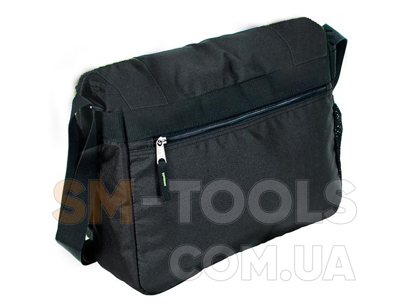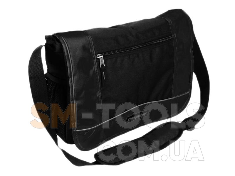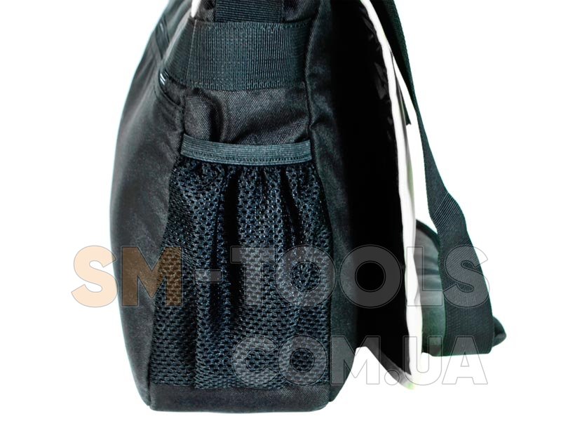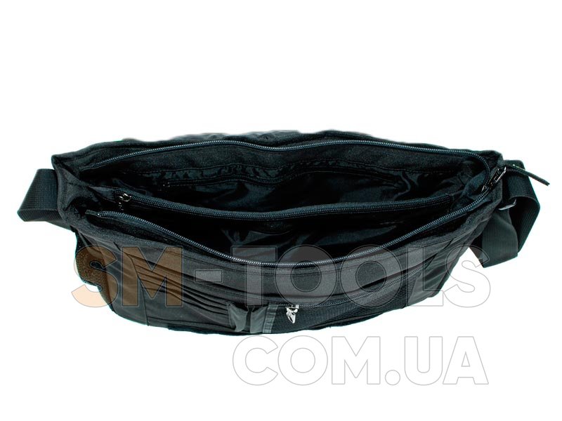 Сумка закрывается широким клапаном на липучку, с фронтальной стороны имеет карман для документов на молнии и светоотражающую вставку.