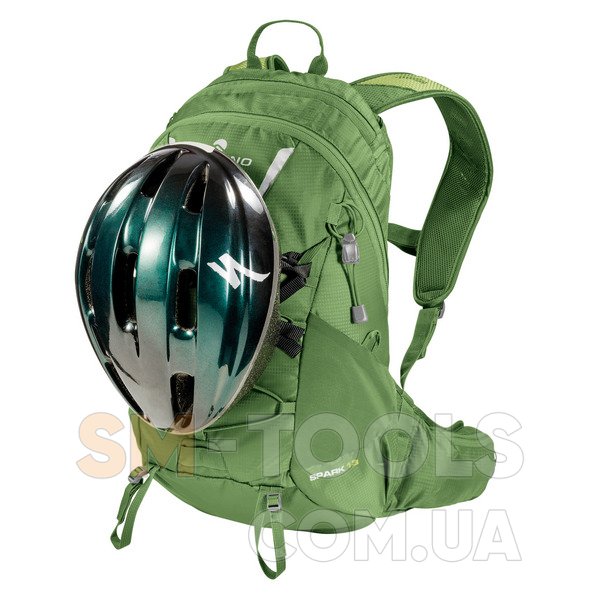 Helmet holder - данный рюкзак оборудован специальным креплением для альпинистской каски или велосипедного шлема. Двухточечное крепление выполнено в виде прочно вшитых петель на фасаде рюкзака, через которые продеваются и фиксируются шлейки каски или шлема. При необходимости экипировка может быть дополнительно зафиксирована эластичными стяжными шнурами на фасаде рюкзака.