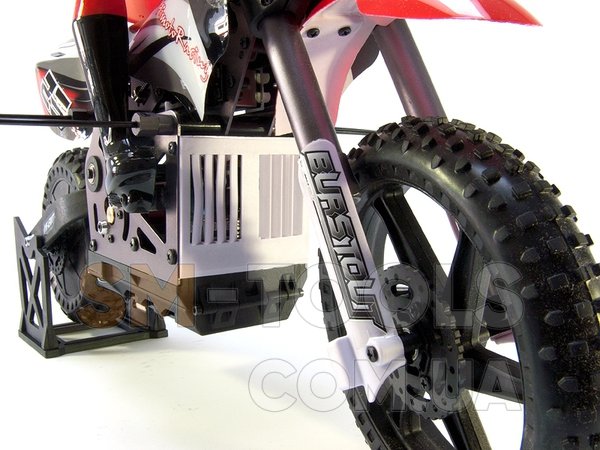 Модель мотоцикла Himoto Burstout MX400 хорошо сбалансирована и укреплена металлическими деталями. Алюминиевая рама, настоящая стальная цепь и закрытый влагозащищённый бокс для электроники обеспечивают надёжность и удароустойчивость. Запатентованная система гироскопов, мощные амортизаторы и сильная рулевая машинка обеспечивают абсолютную устойчивость на любой местности. Сердце мотоцикла - мощный электродвигатель 550-го класса, который питается от Li-pol аккумулятора 7.4В и позволяет разгоняться до 40 км/час.