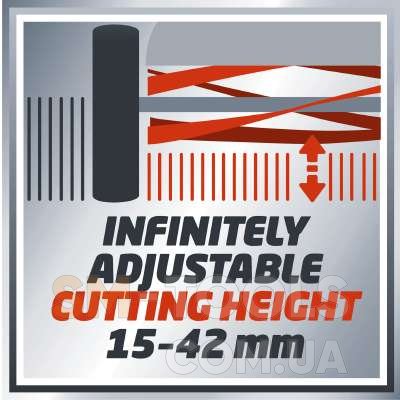 Для удобства регулировки высоты стрижки есть регулировка выбора высоты среза травы. Высота среза на разных уровнях составляет 15-42 мм. Скошенная трава собирается в травосборник объёмом 16 л.