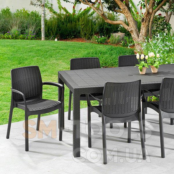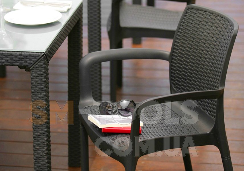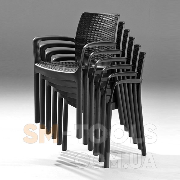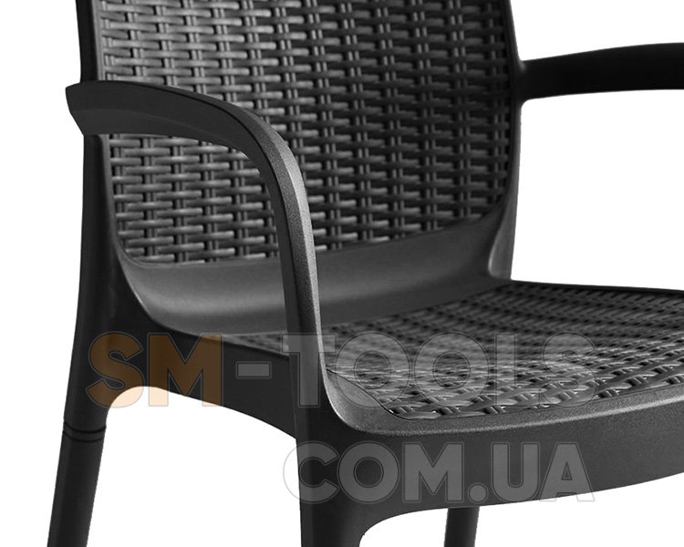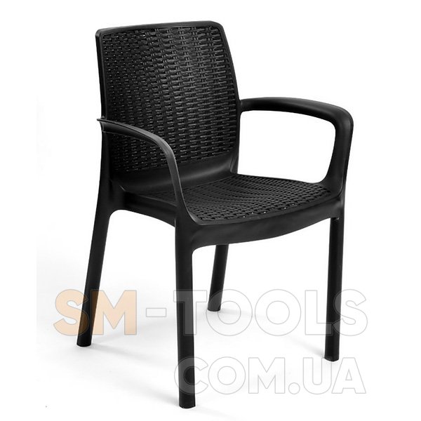 Пластиковый стул с подлокотниками Bali - это удобная спинка, подлокотники и стильный дизайн под искусственный ротанг, который прекрасно сочетается с другими изделиями из пластика имитирующего искусственный ротанг.