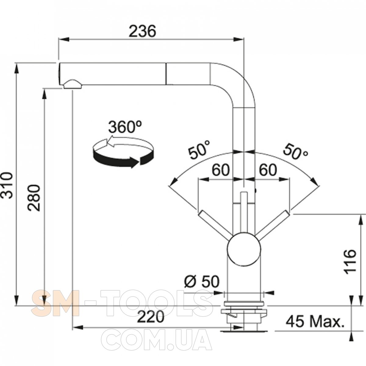 Угол поворота излива 360 °