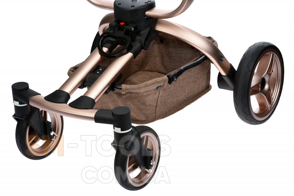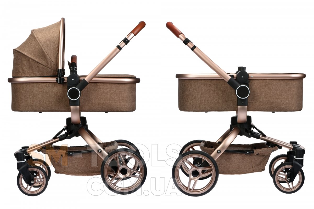 Стильная, качественная коляска коричневого цвета с золотистым шасси - надежное, безопасное транспортное средство для ребенка с рождения и до 3 лет. Универсальная коляска содержит колыбель и прогулочный блок, который выдерживает нагрузку до 12 кг. Также в комплекте дождевик, утепленный чехол для ножек, чехлы для колес, москитная сетка. С такими аксессуарами коляску удобно использовать в любых условиях и обстоятельствах. Облегченный сплав, из которого изготовлено шасси, делает коляску легкой, комфортной в использовании и при этом стойкой и надежной.