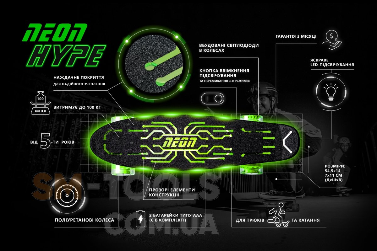Яркий скейтборд с подсветкой - оригинальный транспорт для детей от 5 лет. Скейт можно использовать до подросткового возраста; а на прочность его смогут испытать даже взрослые. Конструкция выдержит нагрузку до 100 кг. Платформа наждачная и совершенно не скользкая, колеса полиуретановые. С ярким скейтбордом Neon Hype ребенок будет в центре внимания. Стильная подсветка платформы будет отличать скейтборд из числа других подобных досок. Скейтборд позволит ребенку полноценно насладиться катанием по городу или его окрестностях.