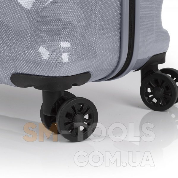 Чемодан оснащен четырьмя полноповоротными, спаренными колесами с возможностью независимого разворота каждого колеса на 360°. Системой предусмотрено равномерное перераспределения нагрузки на каждое колесо, что в свою очередь способствует плавному качению и маневренности чемодана, прилагая при этом минимум усилий.