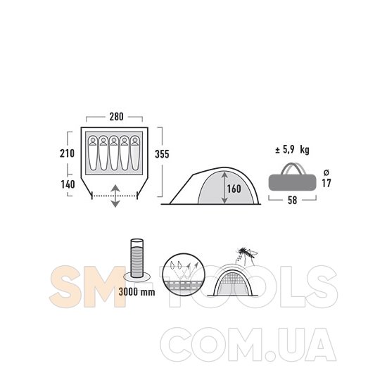 Просторная, двухслойная, 5-ти местная палатка High Peak Nevada. Удобный тамбур для вещей, защищенный от непогоды вход с антимоскитной сеткой, система вентиляции "Vario Vent Kontrol", простая установка.