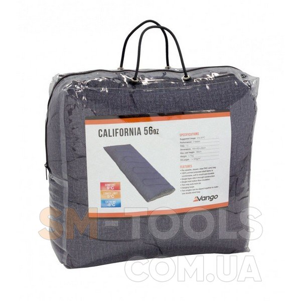 Спальные мешки Vango California были разработаны в первую очередь для любителей отдыха в кемпинговом лагере или путешествий в доме на колесах. Спальный мешок достаточно широкий, чтоб не сковывать движения во время сна. Новый материал, из которого выполнен спальным мешок, сочетает в себе прочность синтетики и привлекательную на внешний вид и на ощупь текстуру натурального хлопка. В отличие от традиционной системы спальных мешков с правосторонней и левосторонней молнией, данная модель имеет универсальную молнию, предусматривающую возможность удобного состегивания двух спальных мешков в один большой. Спальный мешок соответствует Европейскому стандарту EN 13537: 2002. (данный стандарт нормирует требования к спальным мешкам и подтверждает соответствие указанных температурных режимов на ярлыках изделия).