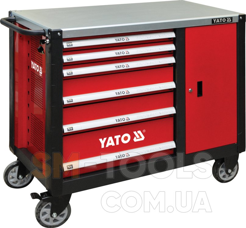 Профессиональный сервисный шкаф Yato оснащен 6-ю ящиками (шухлядами), с центральным замком. Высовываются ящики на шариковых направляющих, основанных на велошариковом механизме, который и предназначен для тяжелых нагрузок. Кроме ящиков (шухляд), шкаф оборудован закрытой тумбочкой с открытыми полками, которые предназначенные для крупногабаритных инструментов. Шкаф имеет металлическую столешницу, максимальная нагрузка на которую - составляет 600 кг. Четыре больших резиновых колеса, диаметром по 160 мм., обеспечивают превосходную маневренность и управление. Благодаря эффективным тормозам и стопорам колес, сервисную тележку можно безопасно установить, в нужном месте. Такие шкафы, наилучше подходят, для автомастерских и станций обслуживания транспортных средств.
