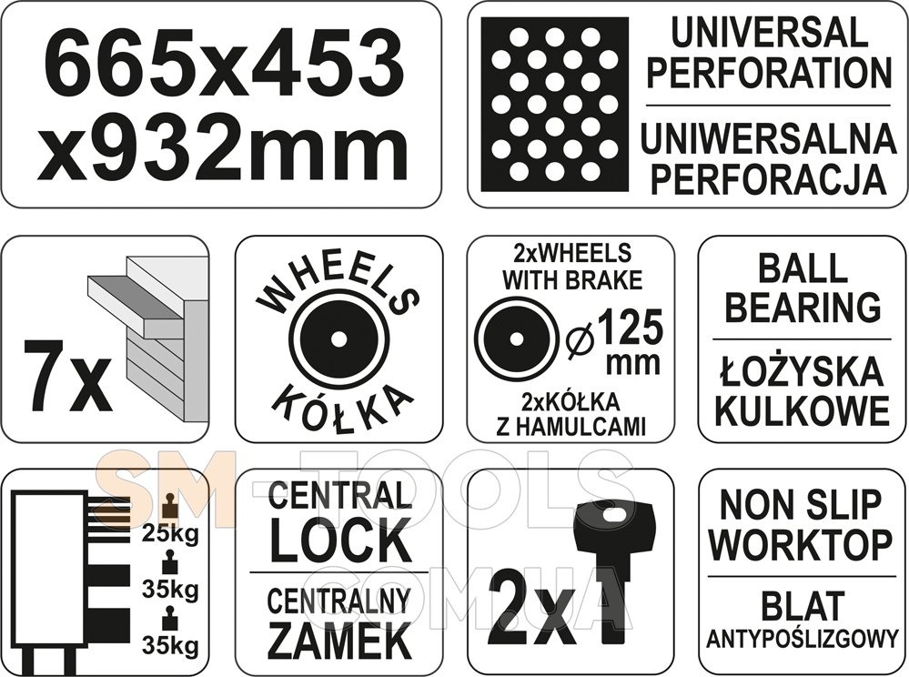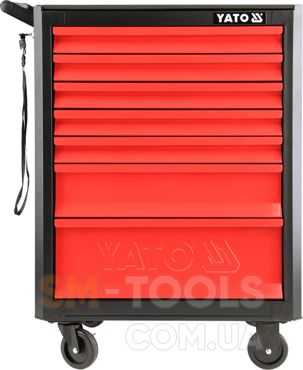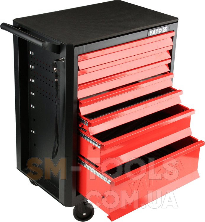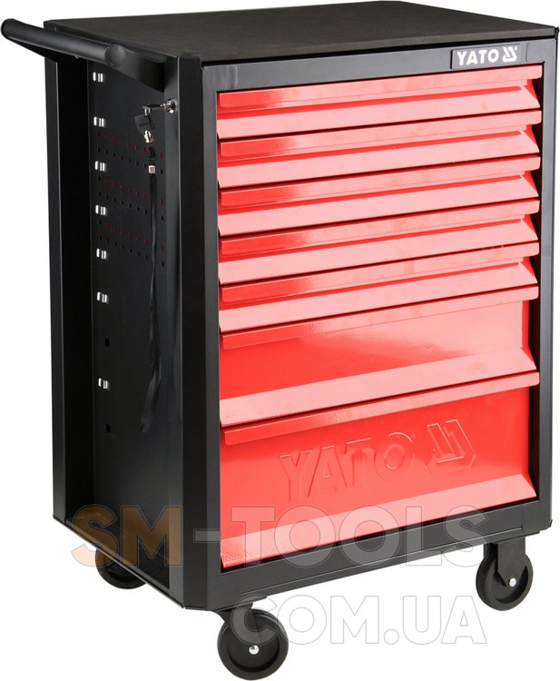 Шкаф для инструментов марки YATO оснащен 7-ю ящиками (шухлядами) - 5 узких, 1 средний и один большой, которые высовываются на шариковых направляющих. Все ящики защищает центральный замок. Шкаф имеет поворотные колеса с тормозом - позволяет удобно перемещать его. Столешница выполнена из твердого металла, покрытого антискользящим материалом. Максимальная нагрузка на столешницу 210 кг. Перфорация боковых стенок позволяет использовать их для дополнительных элементов.
