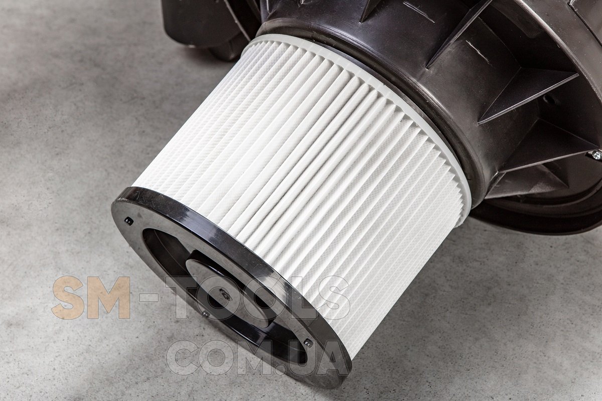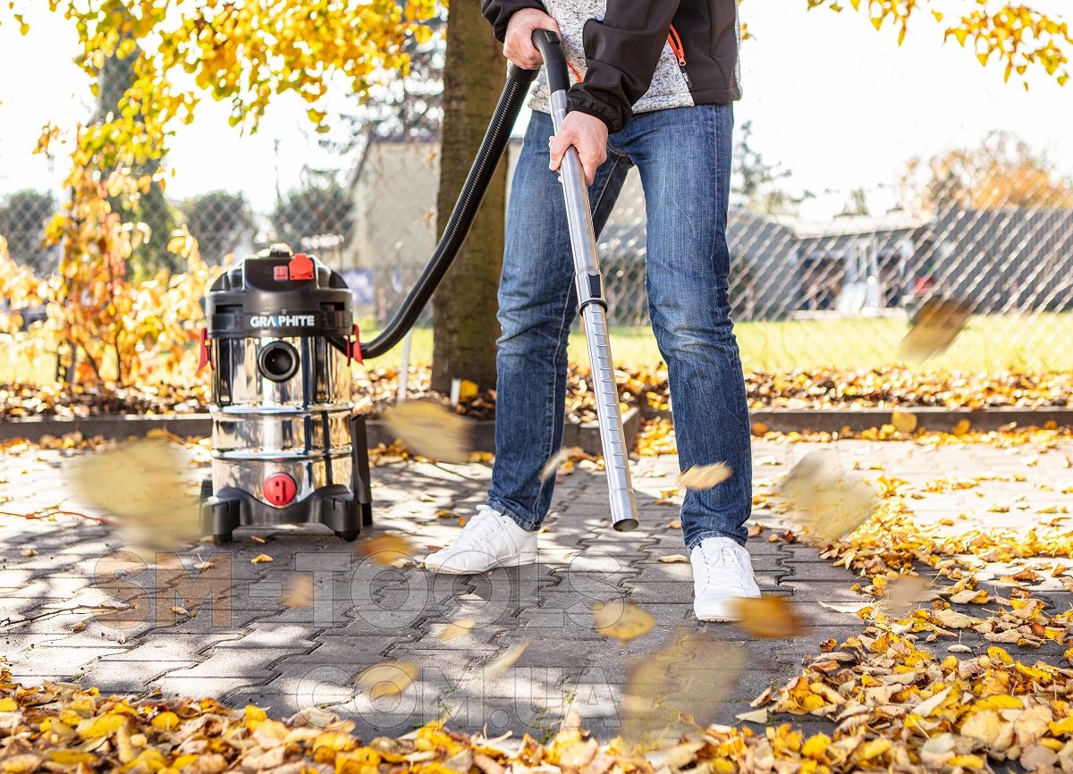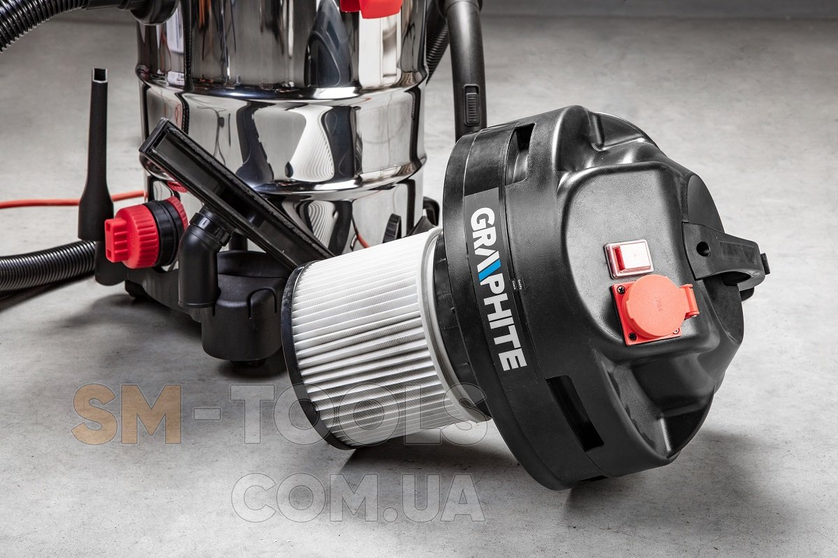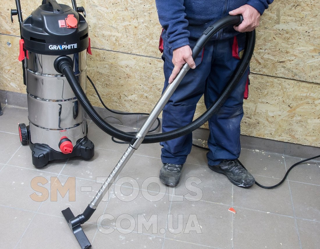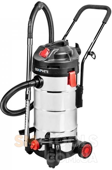 Профессиональный промышленный пылесос GRAPHITE с двигателем мощностью 1500 Вт, предназначен для быстрой и эффективной уборки мусора после выполнения работ в мастерской. Пылесос с вместительным 40-литровым баком из нержавеющей стали, служит как для влажной, так и для сухой уборки. Благодаря большой силе всасывания, равной 18 кПа, и диаметра насадки шланга - 35 мм, пылесос может использоваться для уборки различного мусора. Пылесос с функцией воздуходувки. Кроме того, пылесос оснащен поплавковым клапаном безопасности для влажной уборки и сливной пробкой для слива грязной воды. Большие задние колеса и предотвращения кронштейнами передние колеса обеспечивают безопасное перемещение в тяжелых рабочих условиях. Существует возможность подключения электроинструмента с максимальной мощностью 2000 Вт к розетке пылесоса. Трехпозиционная кнопка включения обеспечивает пуск пылесоса при включении электроинструмента, или пуск только пылесоса без электроинструмента. Пылесос оснащен металлической трубкой с возможностью регулирования ее длины. В основе пылесоса предусмотрено место для хранения сменных насадок. В набор входят: шланг, сменные насадки, телескопическая трубка, пылесборник, поролоновый фильтр, фильтр, фиксаторы шнура питания и переходник.