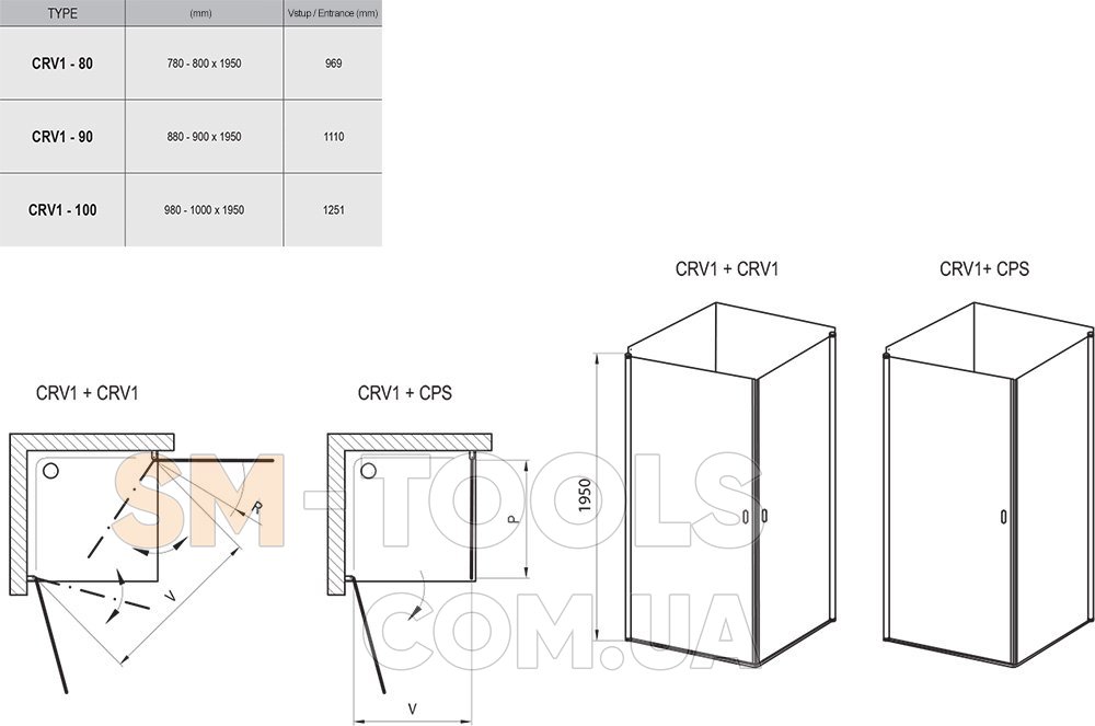 Один виріб CRV1 утворює половину душової кабіни. Для створення прямокутної душової кабіни необхідно замовити 2x CRV1. Виріб встановлюється в облицьований кахлем кут ванної кімнати на піддони RAVAK ANGELA, PERSEUS, PERSEUS PRO, PERSEUS PRO CHROME, GIGANT PRO FLAT, GIGANT PRO FLAT, GIGANT PRO CHROME або безпосередньо на підлогу з вбудованим душовим каналом або трапом.