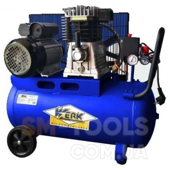 Воздушный компрессор Werk ZBM60-51 масляный. Стандартная система ременного привода от электрического двигателя со шкивом, мощностью в 2 кВт, благодаря которому прибор может выдерживать активные нагрузки. Защита двигателя от перегрева. Система повторного автоматического запуска (возобновляет работу после остывания если перегрелся). Цифровой манометр. Гильзы изготовлены из высококачественного чугуна. Головки цилиндров с большими охлаждающими ребрами. Компрессор удобно транспортировать из одной рабочей зоны в другую благодаря транспортировочным колесам и эргономической ручки.