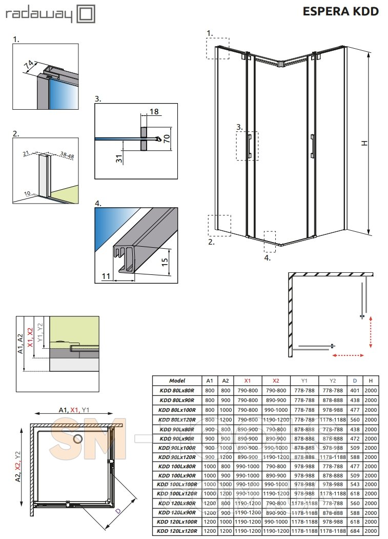 Espera KDD — квадратная или прямоугольная душевая кабина с двойной раздвижной дверью. Коллекция Espera это набор кабин и дверей в нишу которые отличаются надежностью и стилем. Espera создана для употребителей, которые точно знают чего хотят от жизни. Коллекция получила несколько призов от читателей разных журналов. Все изделия из этой коллекции допускается устанавливать как на поддон так и непосредственно на пол. Кроме того, все изделия допускается устанавливать с порогом или без порога меняя нижний фиксатор (в комплекте).