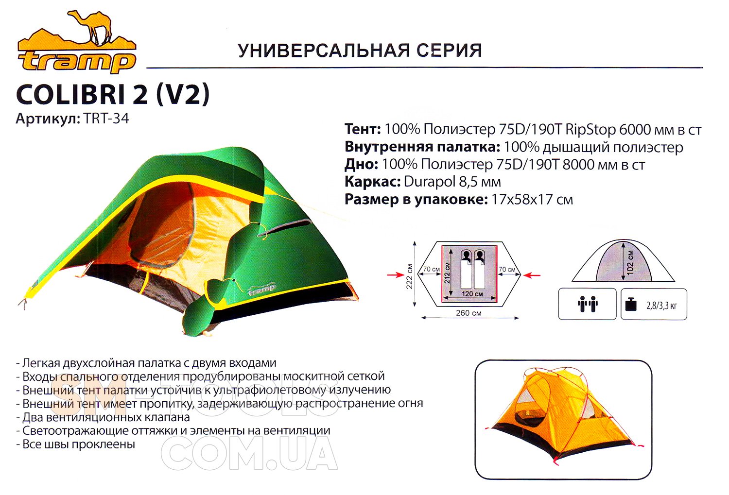 Намет Tramp Colibri є одним з найлегших і компактних трекінгових наметів для подорожей удвох або поодинці. Оригінальна конструкція, що дозволяє покращити вітростійкість намету, не збільшуючи її вагу, що дуже важливо у тривалих походах. Має два входи із оптимальними за розміром тамбурами. Для посиленої подачі повітря, у спеку, є два входи з антимоскітними сітками, які добре пропускають свіже повітря, при цьому захищаючи вас від комах.