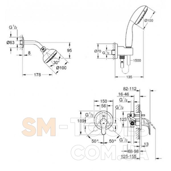 Состав душевого комплекта Шланговое подсоединение, Верхний душ, Настенный держатель, Встраиваемый смеситель, Ручной душ