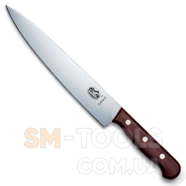 Замечательный кухонный нож для разделки с широким лезвием от швейцарской компании Victorinox. Длина лезвия – 22 см Оснащён удобно сидящей в руке и красивой рукоятью из красного дерева, из-за чего производитель не рекомендует мыть данную модель в посудомоечной машине. Клинок выполнен из высококачественной нержавеющей стали. Превосходно подходит как для нарезания тонких кусков различных видов мяса, птицы и рыбы, так и для резки огурцов, яблок и др.