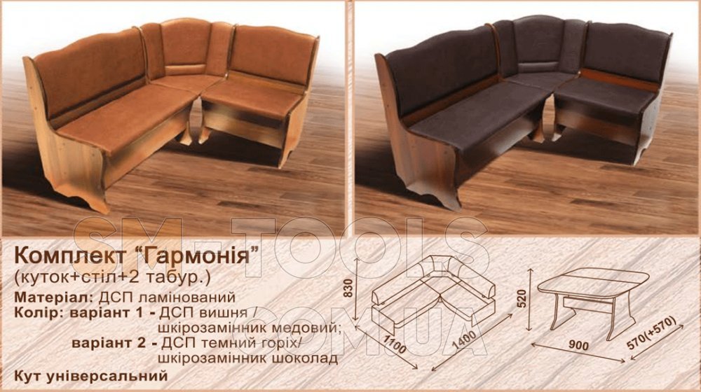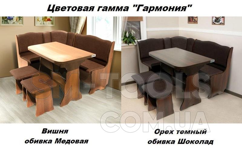В качестве обивки уголка и табуретов служит высококлассная искусственная кожа. Модель может быть представлена в 2 вариантах цвета обивки – медовый или шоколадный. Любой из них просто шикарно будет смотреться в сочетании с оттенком ДСП на корпусе изделий.