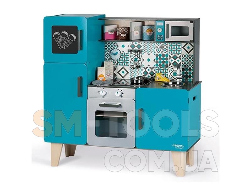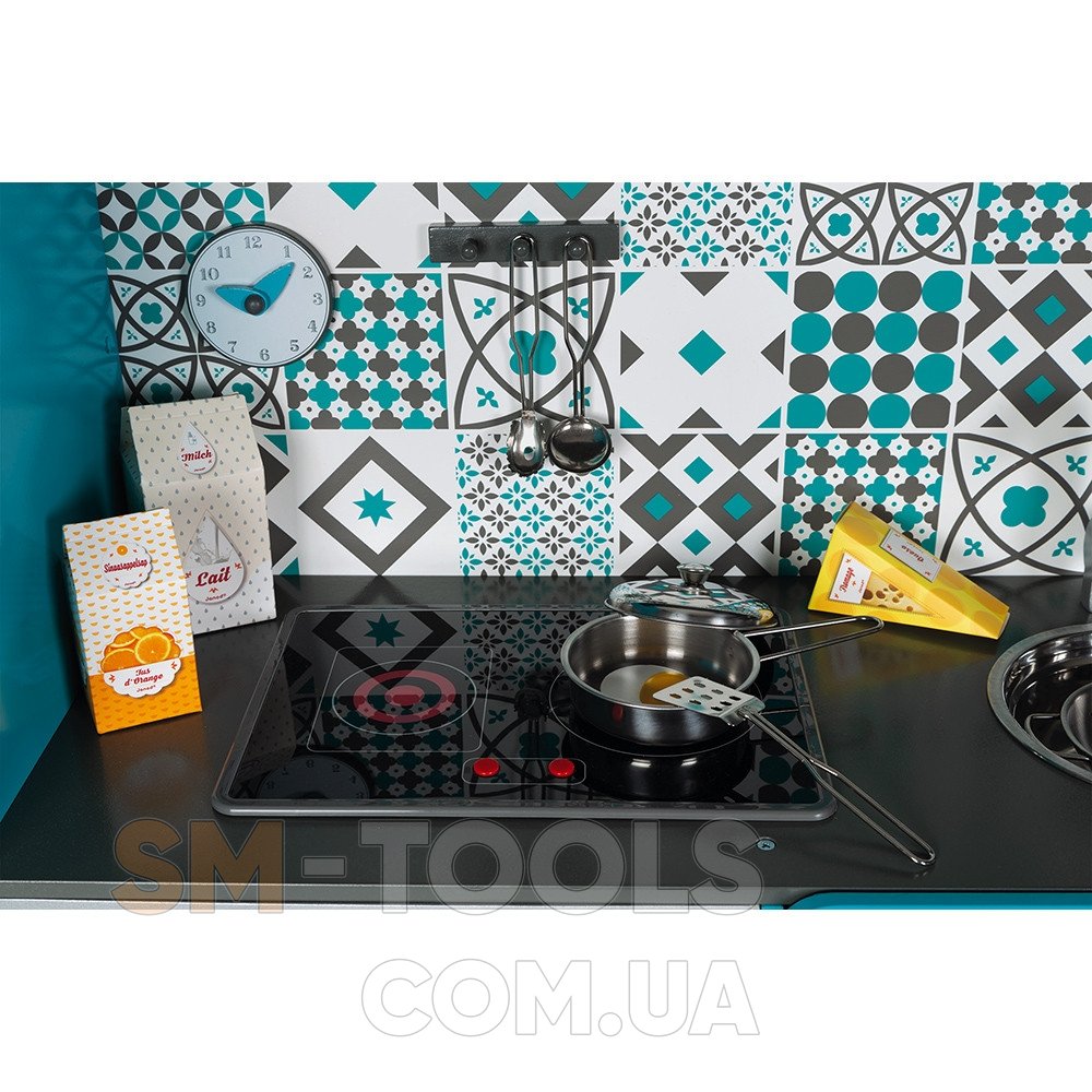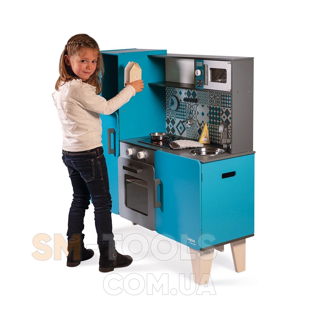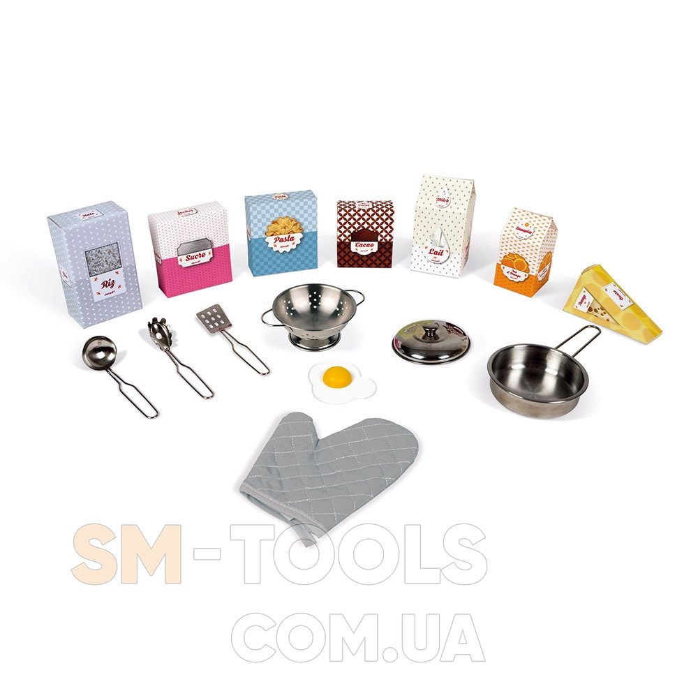 Приготовь вкусные блюда для своих друзей, как мама и папа, и стань маленьким шеф-поваром! В набор входит 15 аксессуаров, среди которых набор колышков для подвешивания 3 металлических ложек, 1 металлическая кастрюля и крышка, 1 металлический дуршлаг, перчатка для духовки, жареное яйцо и 7 картонных коробок для еды (какао, сахар, апельсиновый сок, макаронные изделия, сыр, молоко и рис). Варочную поверхность со световыми и звуковыми эффектами, работает от 2-х АА батареек (не входят в комплект). Кухня произведена из натурального дерева.