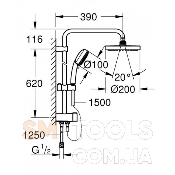 - верхний душ диаметром 200 мм с 2 типами струи ( Rain, SmartRain ), с шаровым шарниром, угол поворота ± 15 градусов