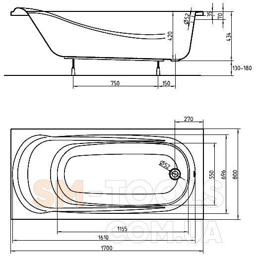 Ванна KOLO SAGA 170 * 80 см, з ніжками і сифоном автомат