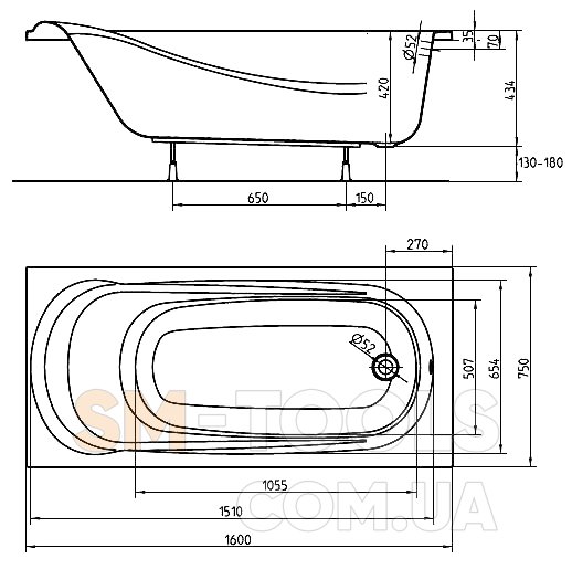 Ванна KOLO SAGA 160 * 75 см, з ніжками і сифоном автомат