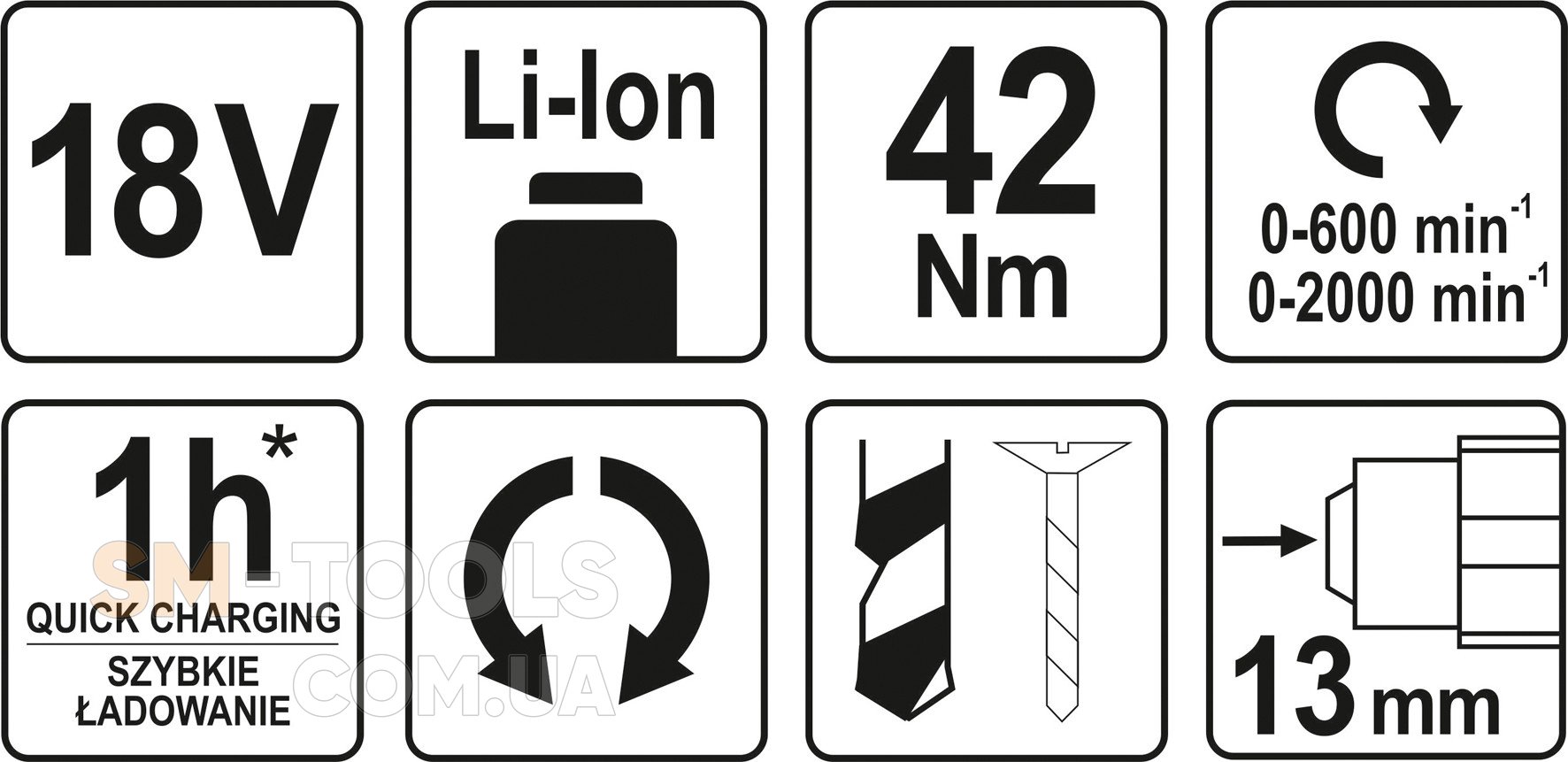 - Запасні акумулятори ємністю: 2 Ач (YT-82842), 3 Aч (YT-82843) та 4 Aч (YT-82844)