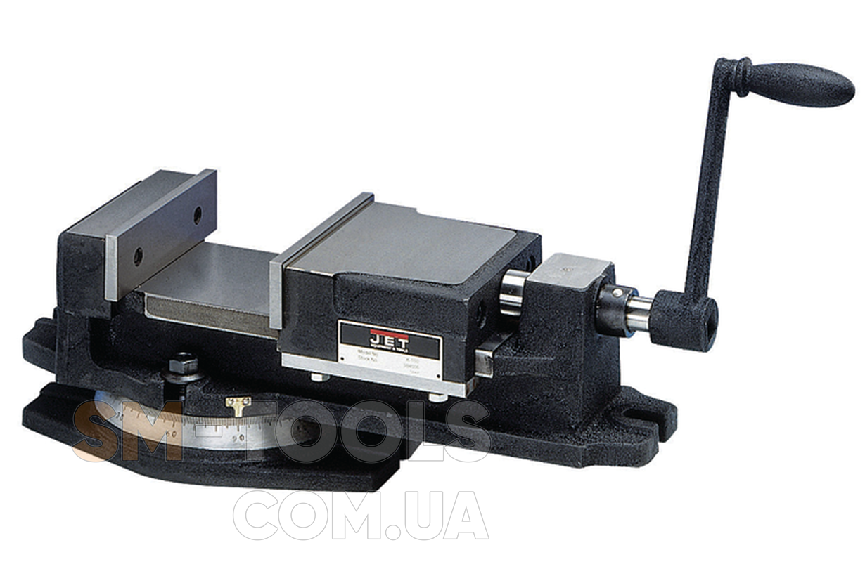 Поворотные машинные тиски представляют один из вспомогательных элементов оснастки, используемой в работе на универсальных фрезерных станках, выпускаемых компанией JET. Приспособление применяется для жесткой фиксации заготовок в процессе последующей чистовой обработки. Тиски обладают поворотным механизмом, обеспечивающим позиционирование оснастки и заготовок в горизонтальной плоскости в диапазоне 360 градусов . Одна из губок приспособления имеет специальные пазы, рассчитанные на фиксацию заготовок различной формы. Действие прижимного механизма обеспечивается круговым вращением рукояти.