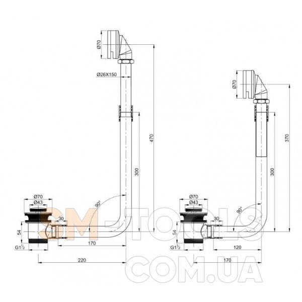 Высота и длина сифона регулируема, на схеме приведены минимально и максимально возможные установочные параметры.