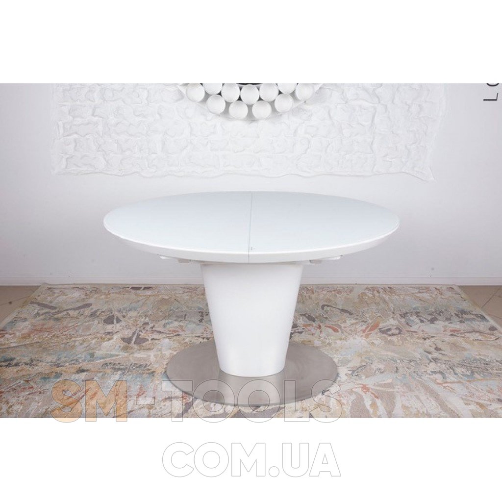 Овальная столешница сделана из матового закаленного стекла белого на базе из МДФ. На такой столешнице практически не заметны отпечатки пальцев и следы от посуды, но мы рекомендуем использовать подставки или салфетки под тарелки и столовые приборы. Дополнительные панели располагаются посередине, сделаны из крашенного МДФ в тон столешницы. Чтобы разложить стол, нужно просто раздвинуть стеклянную столешницу и достать вставки. Детали раздвижного механизма сделаны из металла и рассчитаны на длительный срок эксплуатации.