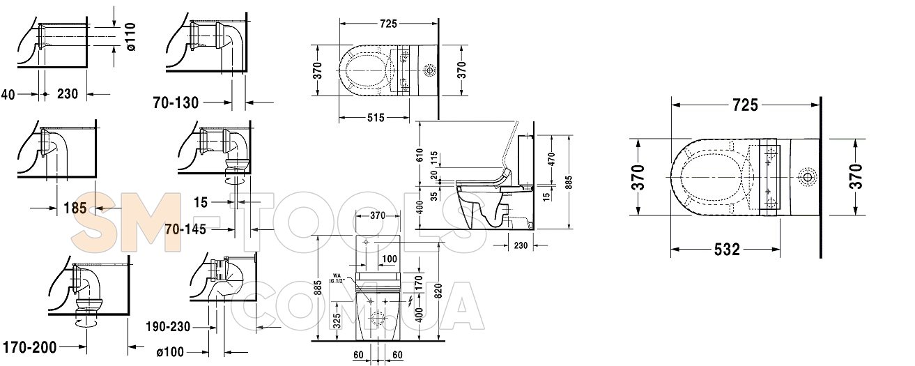 С отдельным бачком (не вкл. бачок), с вертикальным смывом, только в сочетании с SensoWash, включая компоненты для SensoWash со скрытым подключением, включая крепление, 370 x 725 мм, White Alpin, Cмыв объемом 4,5 л, сток для комплекта подключения варио, сток горизонтальный и вертикальный 70 - 200 мм, длина регулируется, а также колено для подключения варио, сток вертикальный 190 - 245 мм.