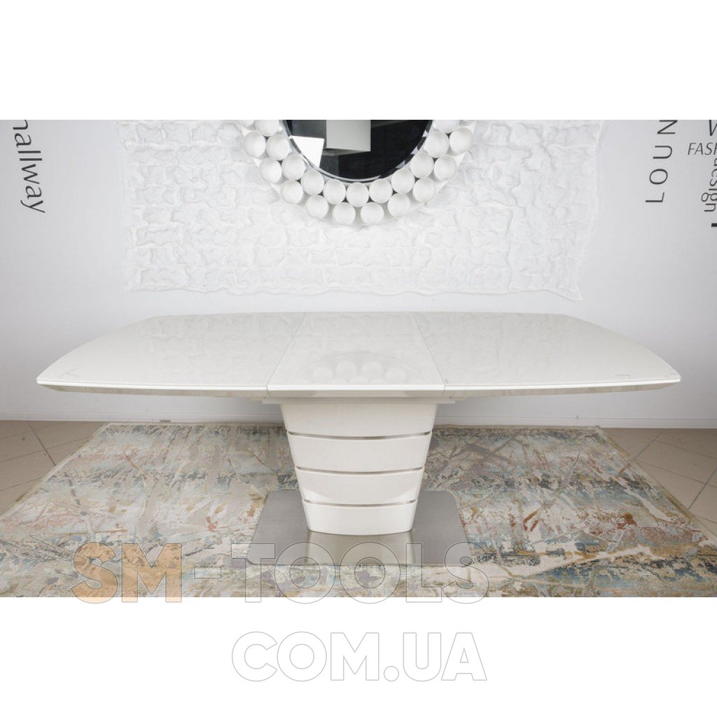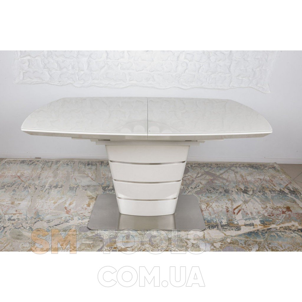 Столешница сделана из глянцевого закаленного стекла кремового цвета на базе из МДФ. На такой столешнице могут быть хорошо заметны отпечатки пальцев и следы от посуды, поэтому мы рекомендуем использовать подставки или салфетки под тарелки и столовые приборы. Дополнительные панели располагается посередине, сделаны из МДФ в тон столешнице. Чтобы разложить стол, нужно просто раздвинуть стеклянную столешницу и достать вставки. Детали раздвижного механизма сделаны из металла и рассчитаны на длительный срок эксплуатации.