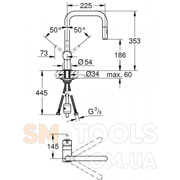 - вынос излива - 225 мм