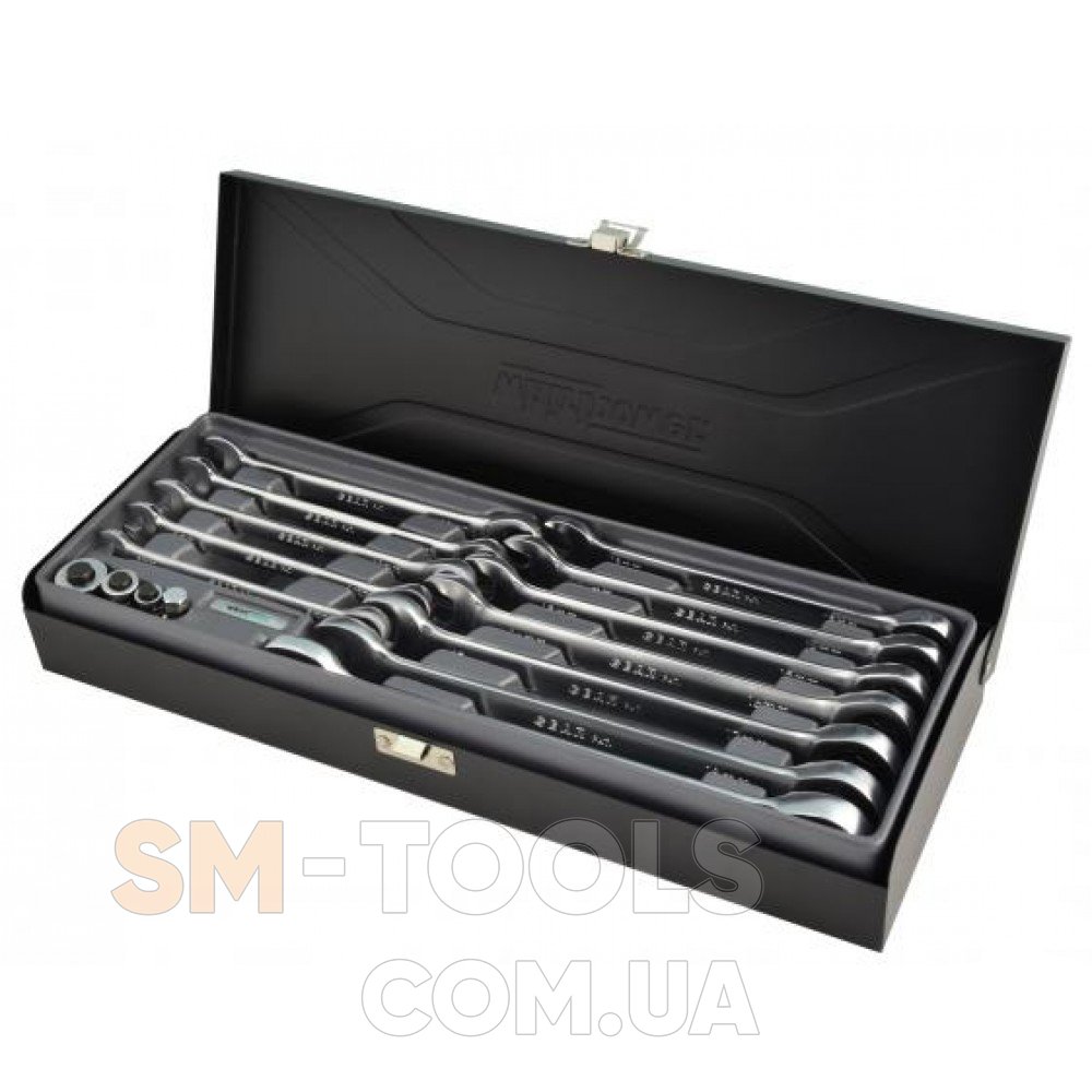 Набор трещоточных ключей Whirlpower 1244-11-WR09 8-19 мм состоит из 12 трещоточных ключей, 3-х головок и шестигранного битодержателя для закручивания/выкручивания болтов, гаек и прочих резьбовых соединений. Данный набор поставляется в прочном металлическом кейсе, который позволяет компактно хранить их практически в любом месте, не боясь повреждений.