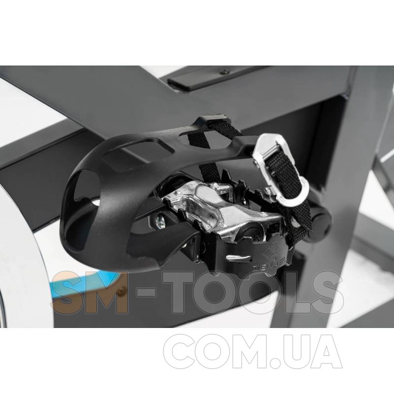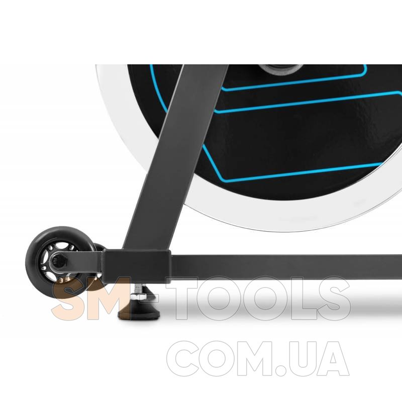 Спінбайк оснащений ковзними педалями з фіксаторами та аварійним гальмом . Посилена конструкція і ролики, що вирівнюють, вбудовані в задній стабілізатор, забезпечують безпеку вправ. Після закінчення тренування не доведеться турбуватися про те, що Ваша вітальня продовжуватиме нагадувати тренажерний зал, адже сайкл має транспортні ролики, які дозволять прибрати його, наприклад, у шафу.