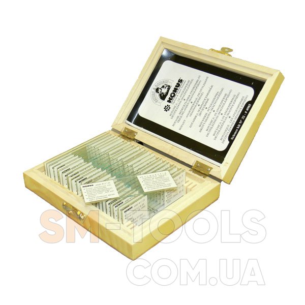 Набор из 25 подготовленных препаратов для биологических микроскопов в удобной деревянной коробочке.