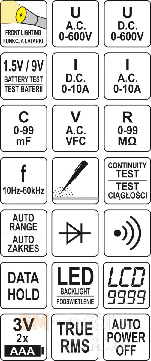 Мультиметр Yato YT-73094 предназначен для измерения переменного и постоянного напряжения и тока. Это также позволяет измерять другие значения, в том числе сопротивление, емкость и проверка работы диодов. Это особенно полезно при обнаружении неисправных компонентов электроустановок.