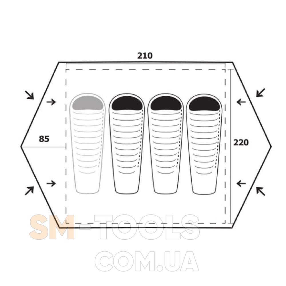 Намет для 3-4 чоловік. Два входи із тамбуром забезпечують користувачам комфорт. Намет також придатний для використання у вимогливих умовах високогірного туризму. Тристрижнева конструкція стійка навіть при сильних поривах вітру. Тамбури дуже просторі для багажу чи приготування їжі.
