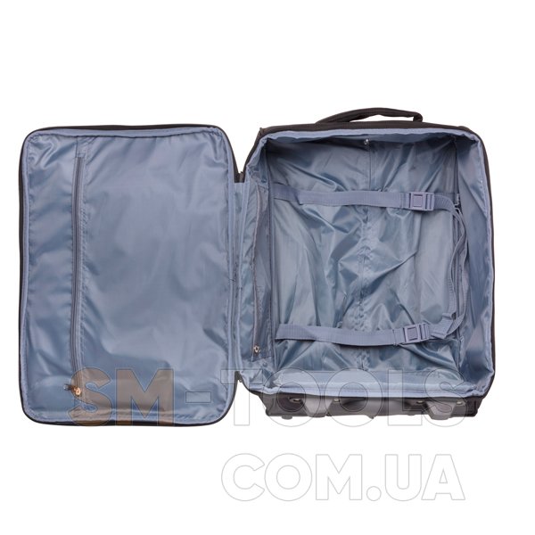 Эргономичная система выдвижной телескопической ручки с кнопочным фиксатором позволяет отрегулировать высоту выдвижной ручки для дополнительного удобства и комфорта пользователя. Внутренний объем разделен перегородкой на два отделения и имеет ремни для фиксации вещей и дополнительные карманы.